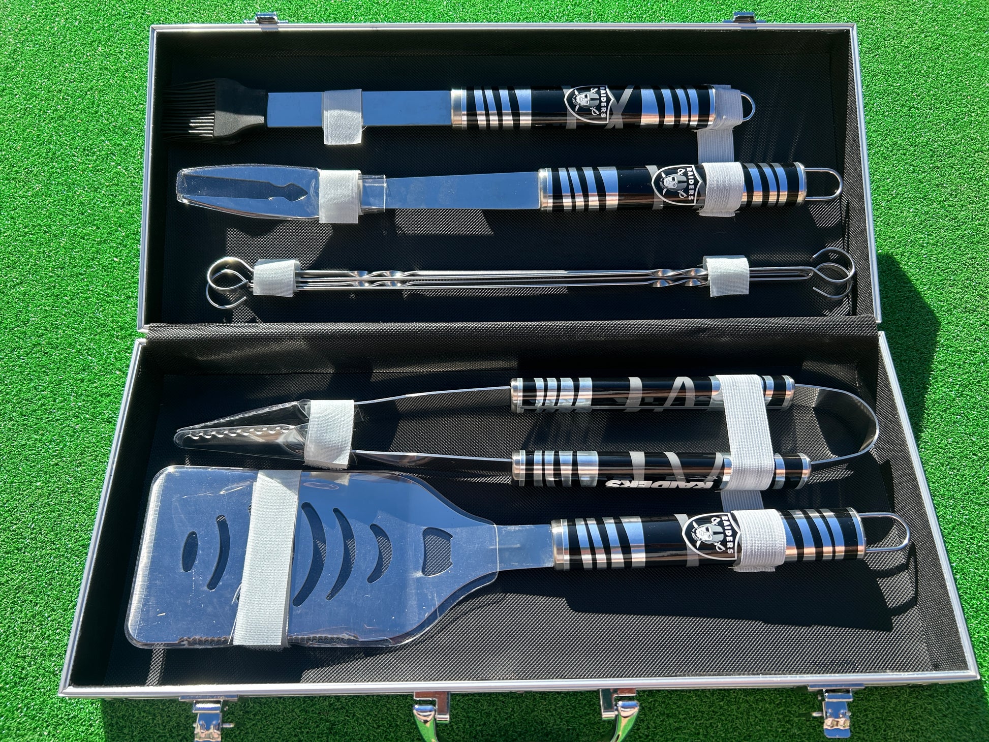 - Each tool features vivid Las Vegas Raiders graphics, and the case features a 4-inch team logo.