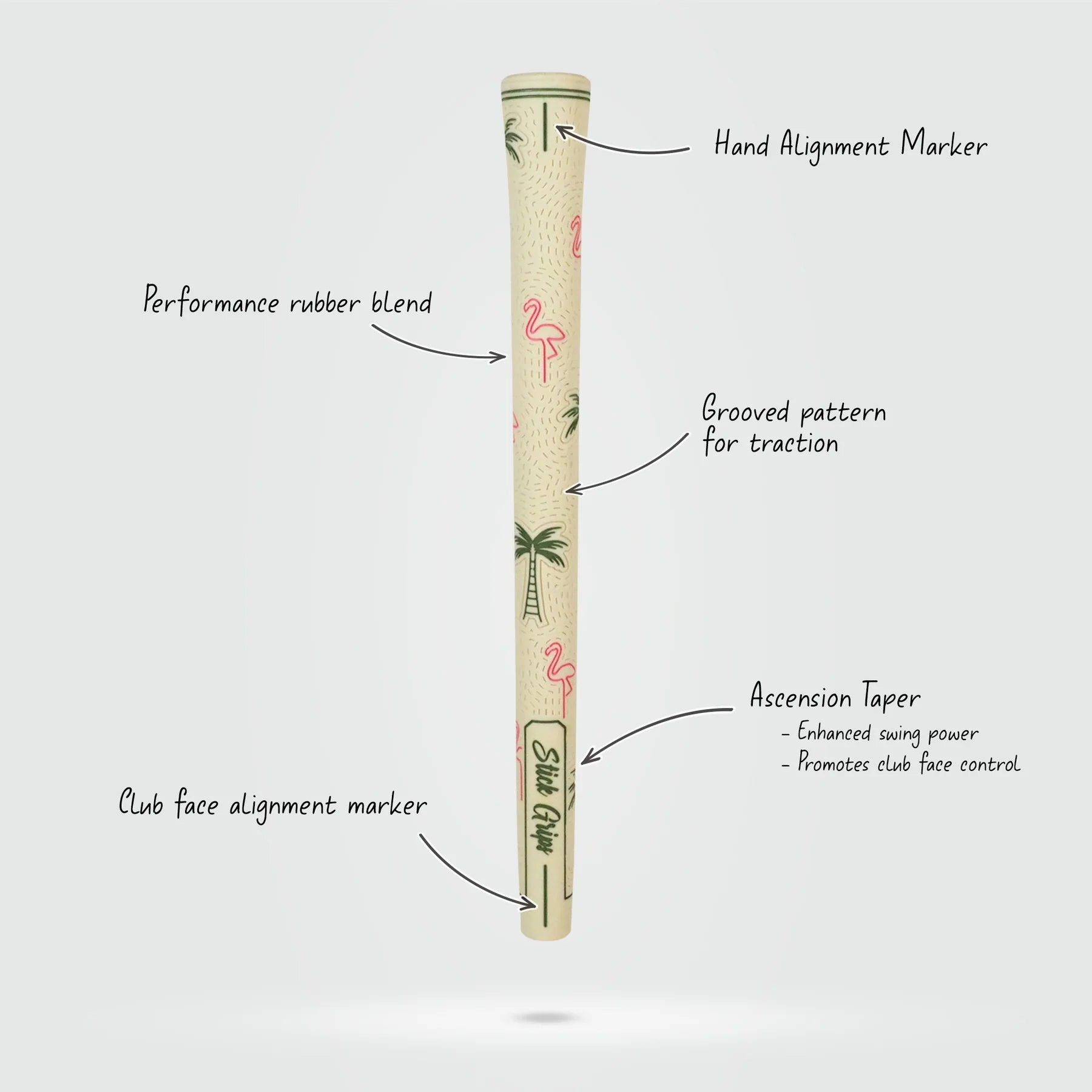 - Standard size golf grip with Ascension Taper – A wider diameter standard grip that tapers less towards lower hand creating a relaxed hand grip on the golf shaft. Prompting more swing power and club face control.